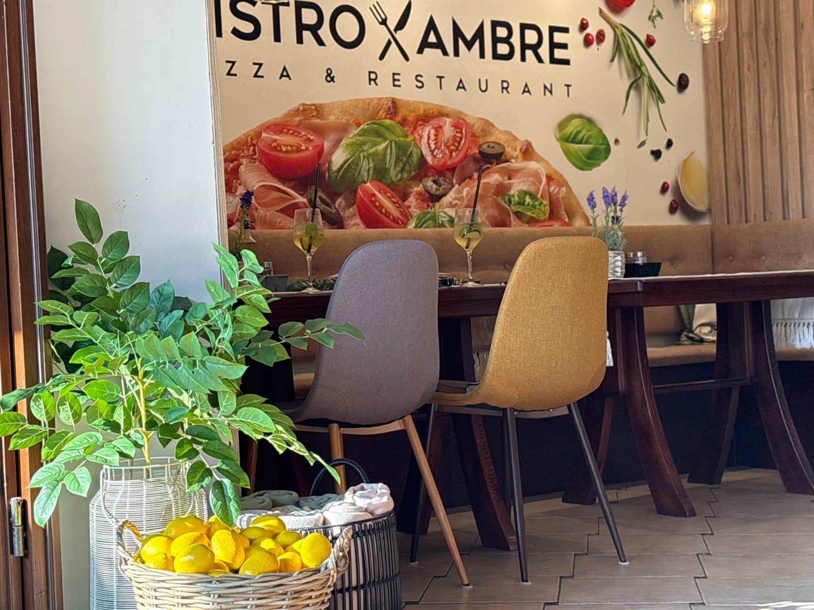 Menu Bistro Ambre łączy kuchnię włoską i polską. Goście mogą wybierać spośród świeżo wypiekanej pizzy z pieca opalanego drewnem, domowych makaronów, sałatek, a także lokalnych dań obiadowych. Na deser dostępne są smaczne ciasta, lody i napoje, które sprawiają, że każdy posiłek staje się pełnym doświadczeniem kulinarnym.